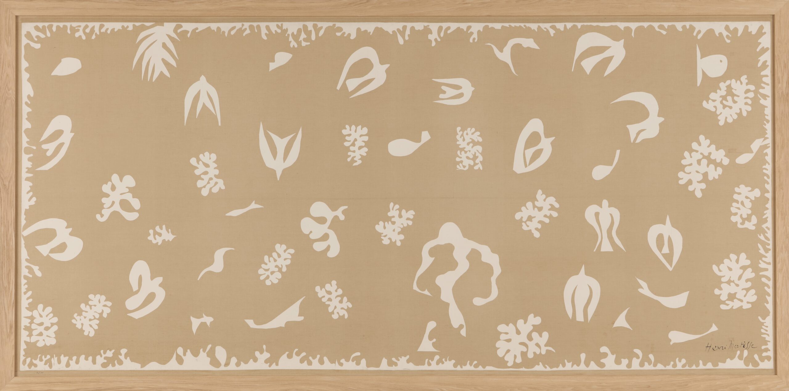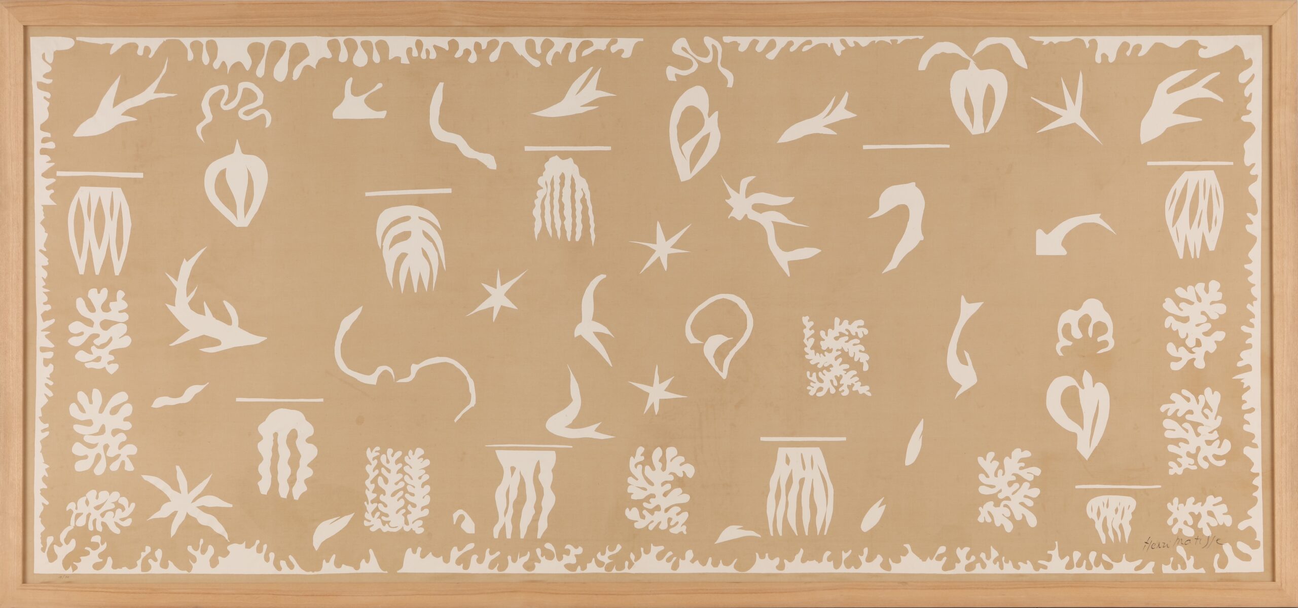 最初は書籍のために始められた切り紙絵ですが、初めて切り紙絵で作られた大きな作品が「オセアニア海」と「オセアニア空」でした。登場する鳥や魚、海藻や珊瑚(さんご)などの形は、タヒチへの旅行の際に着想を得ています。マティスは、アパルトマンの食堂の壁にそれぞれの切り絵をピンで留めながら作品の構想を練り上げていきました。本作は単色のシルクスクリーンであり、色彩の魔術師とも言われたマティスの作品としては意外かもしれませんが、彼の画業におけるターニングポイントを示す重要な作品です。