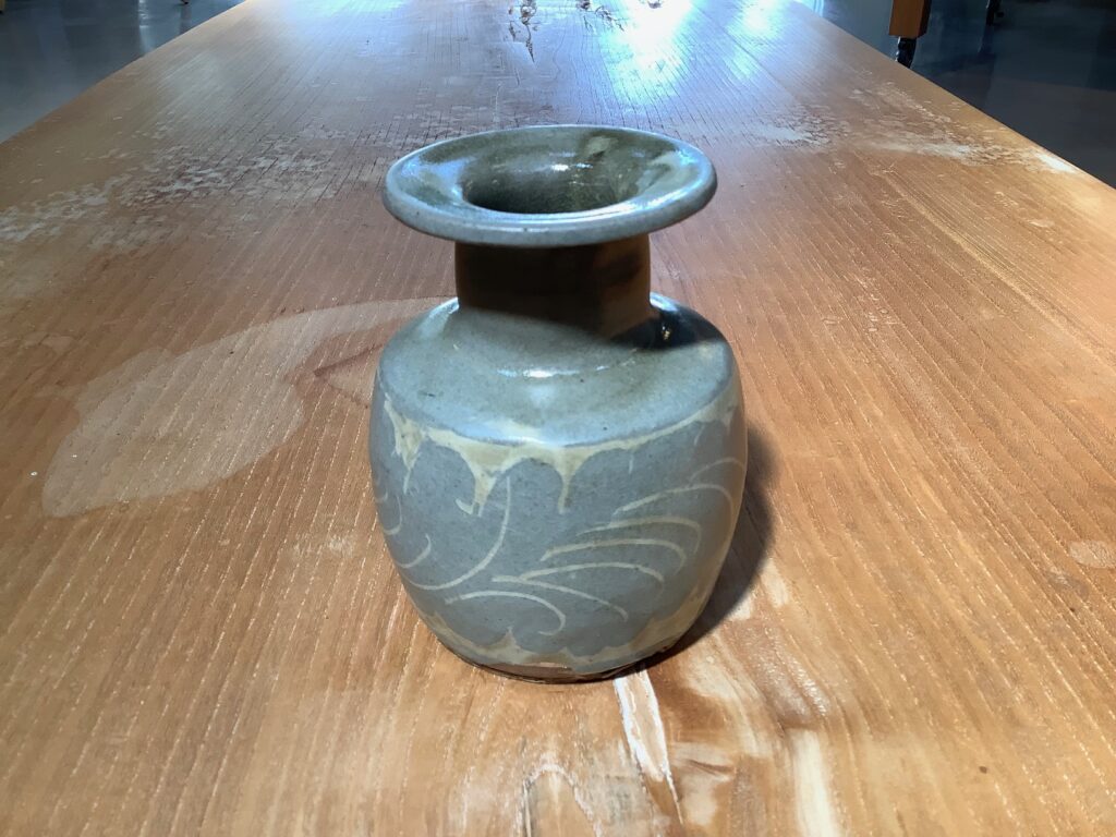 一つは英国の古い伝統陶芸のスリップウェアで、もう一つは、中国宋代風の炻器(せっき)(陶器と磁器の中間的な性質を持つ焼き物)でした。当時浜田庄司が制作した所蔵品3点のうち一つが、17世紀英国のスリップウェアの様式を施した彩色蓋付壺(ふたつきつぼ)です。その彩色はイッチン(細い口金道具)に化粧土や釉薬を入れ、素地の上に絞り出すようにして文様を自由に描いたものです。それは、筒描きとも言われる技法です。彼自身、西洋の文化を理解しつつ、その技術を巧みに使って成形された、本当に苦心惨憺(さんたん)の作品に思えます。他の2点は、中国と高麗の陶芸技術である画花(ヘラなどで陶磁器の表面に文様を彫りこむ技法)と象嵌(ぞうがん)(一つの素材に異なる素材を嵌め込む装飾技法)を使った青釉炻器です。本当に、中国と高麗の伝統的な作陶技術を見事に再現させた作品です。