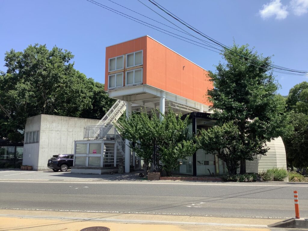 美術館の外観は積み木遊びのように丸、三角、四角をうまく取り混ぜ、オレンジ色に塗った長方形を2階に突出させ、クリーム色で塗り分けたドームと三角形を並べた大屋根、というように風変りにデザインされています。
